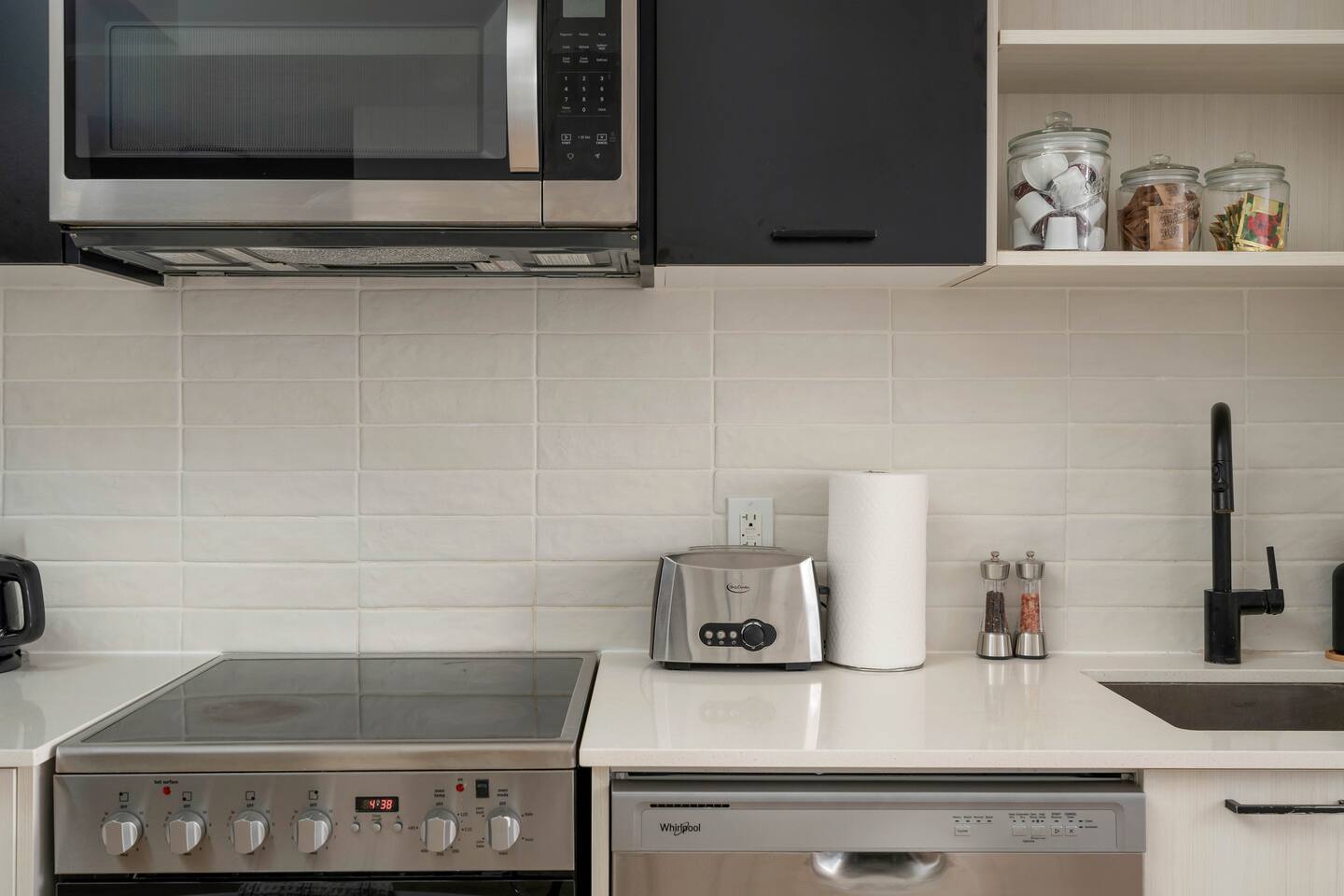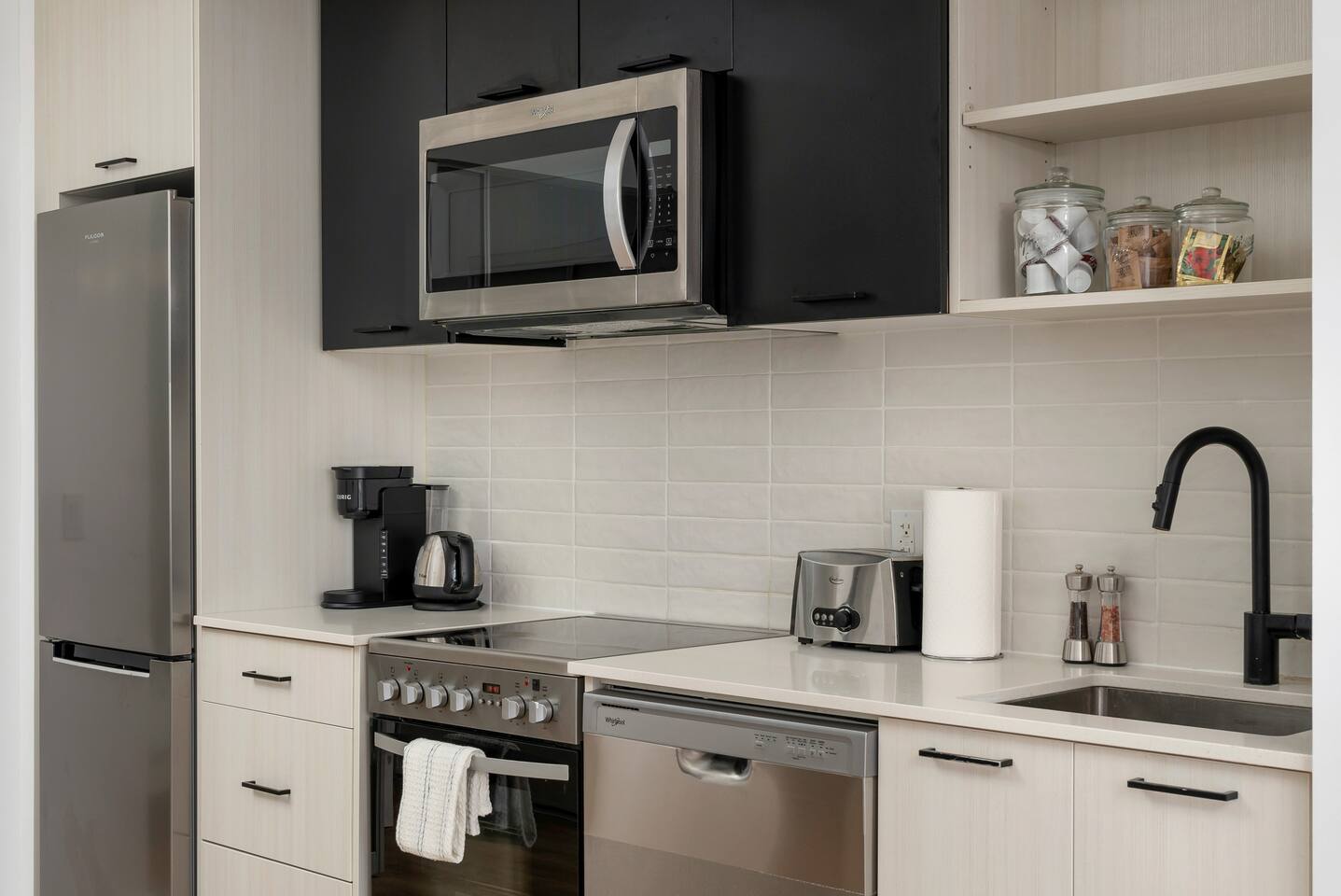 Comfortable suite with two queen beds, equiped kitchen, laundry, and private balcony—ideal for families, groups, or business stays.