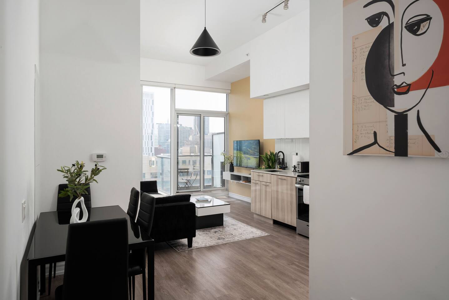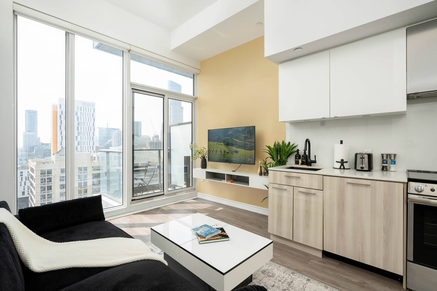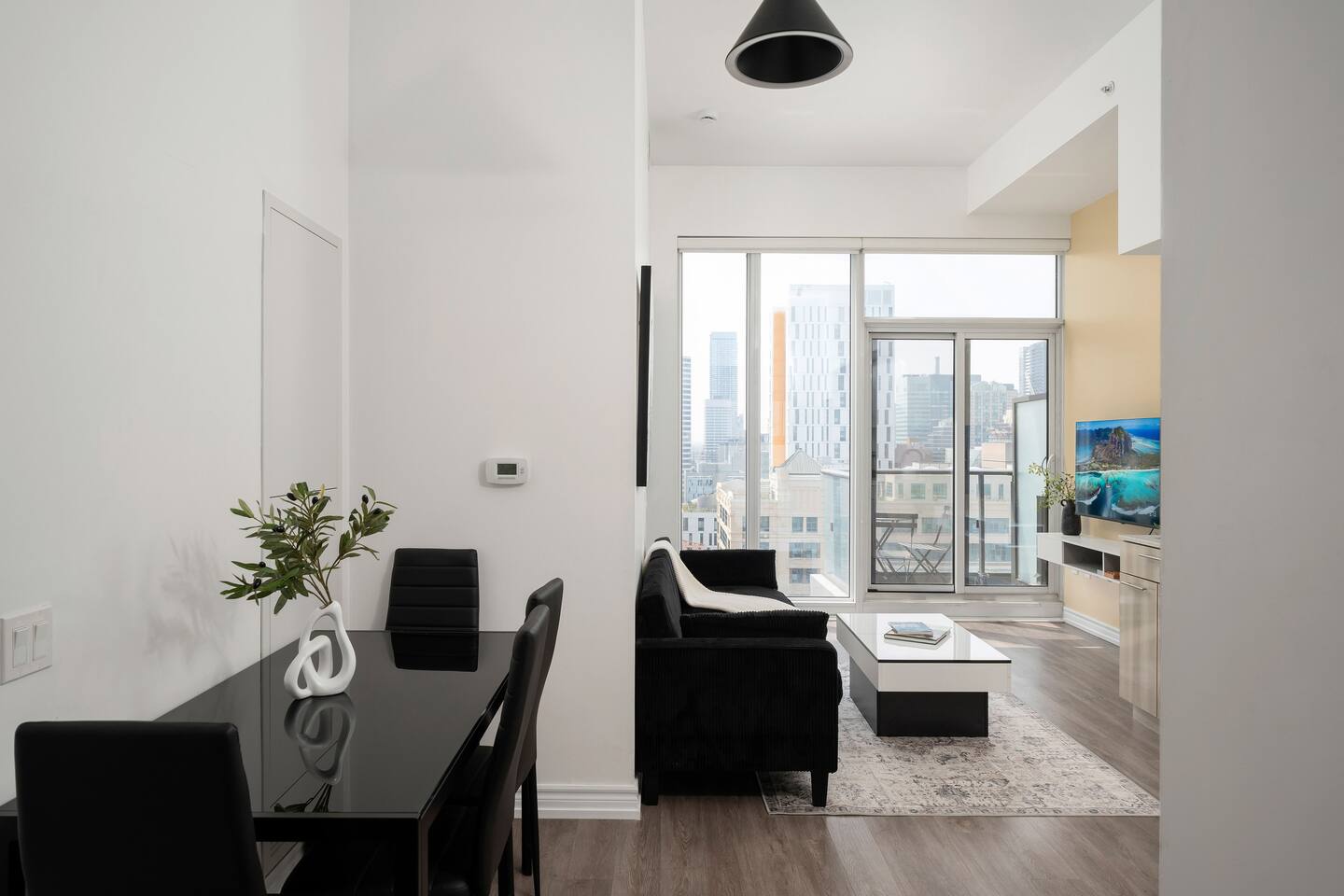 Modern 2-bedroom condo in downtown Toronto! Walk to Dundas Square, Eaton Centre, and tons of restaurants. Easy access to transit. Ideal for work trips or city getaways!