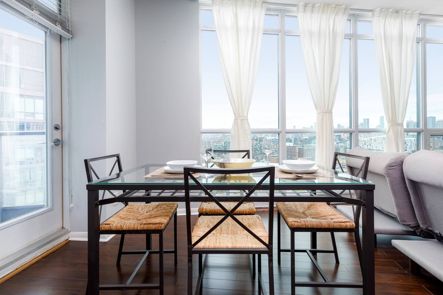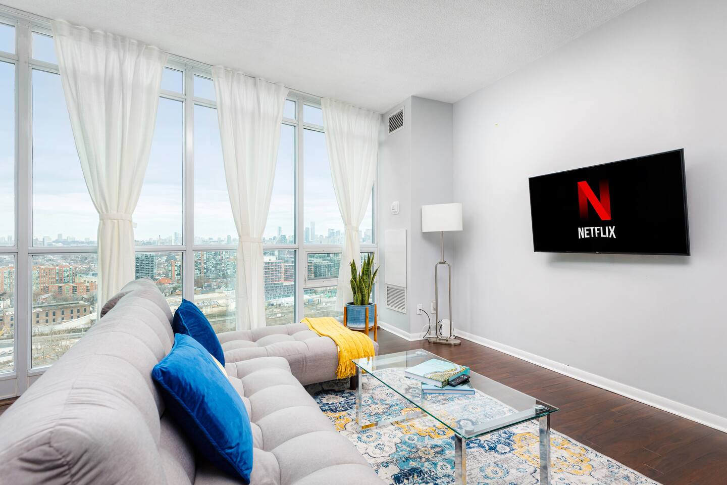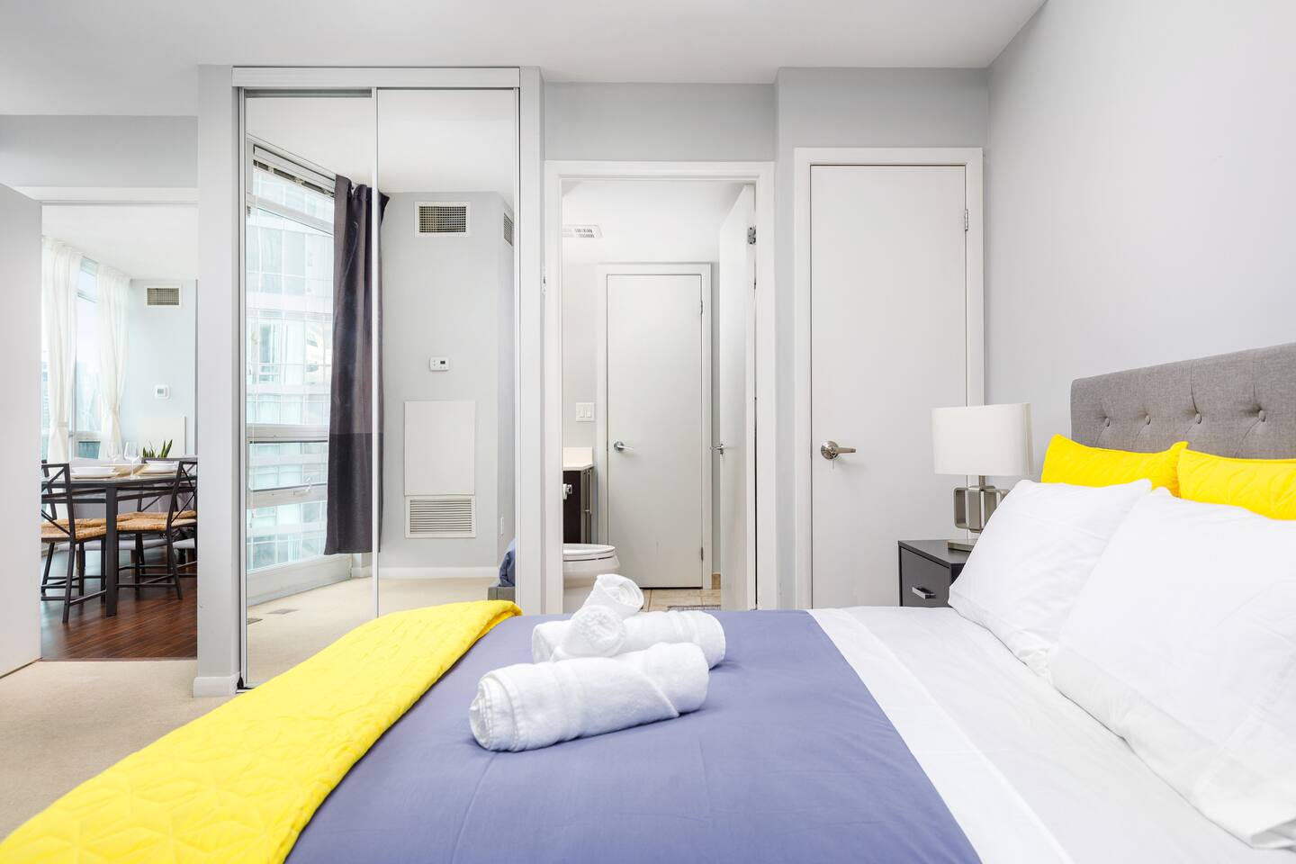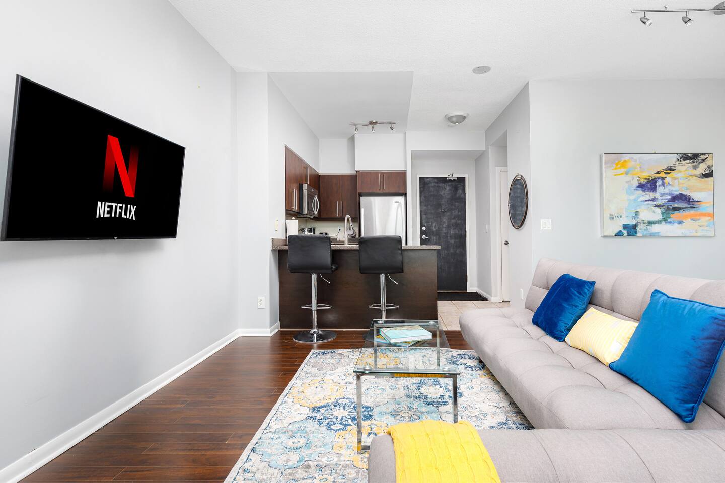 This stylish one-bedroom apartment in the Fort York area of downtown Toronto is steps away from major attractions like the Metro Toronto Convention Centre, Rogers Centre, and CN Tower. Enjoy stunning city skyline views while having all the essentials for a comfortable stay.