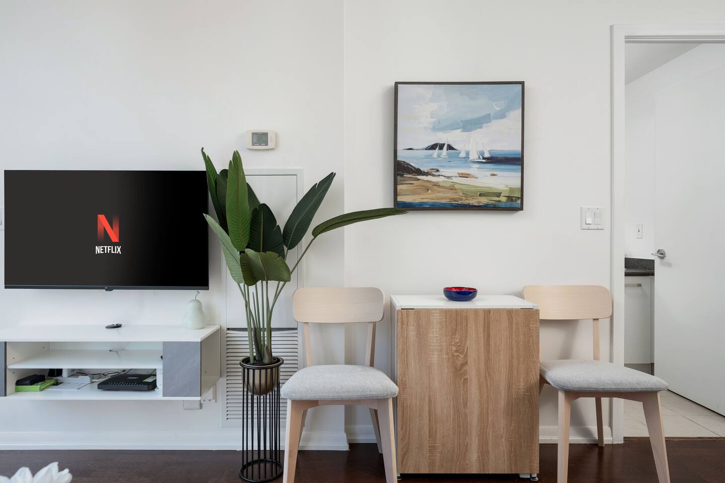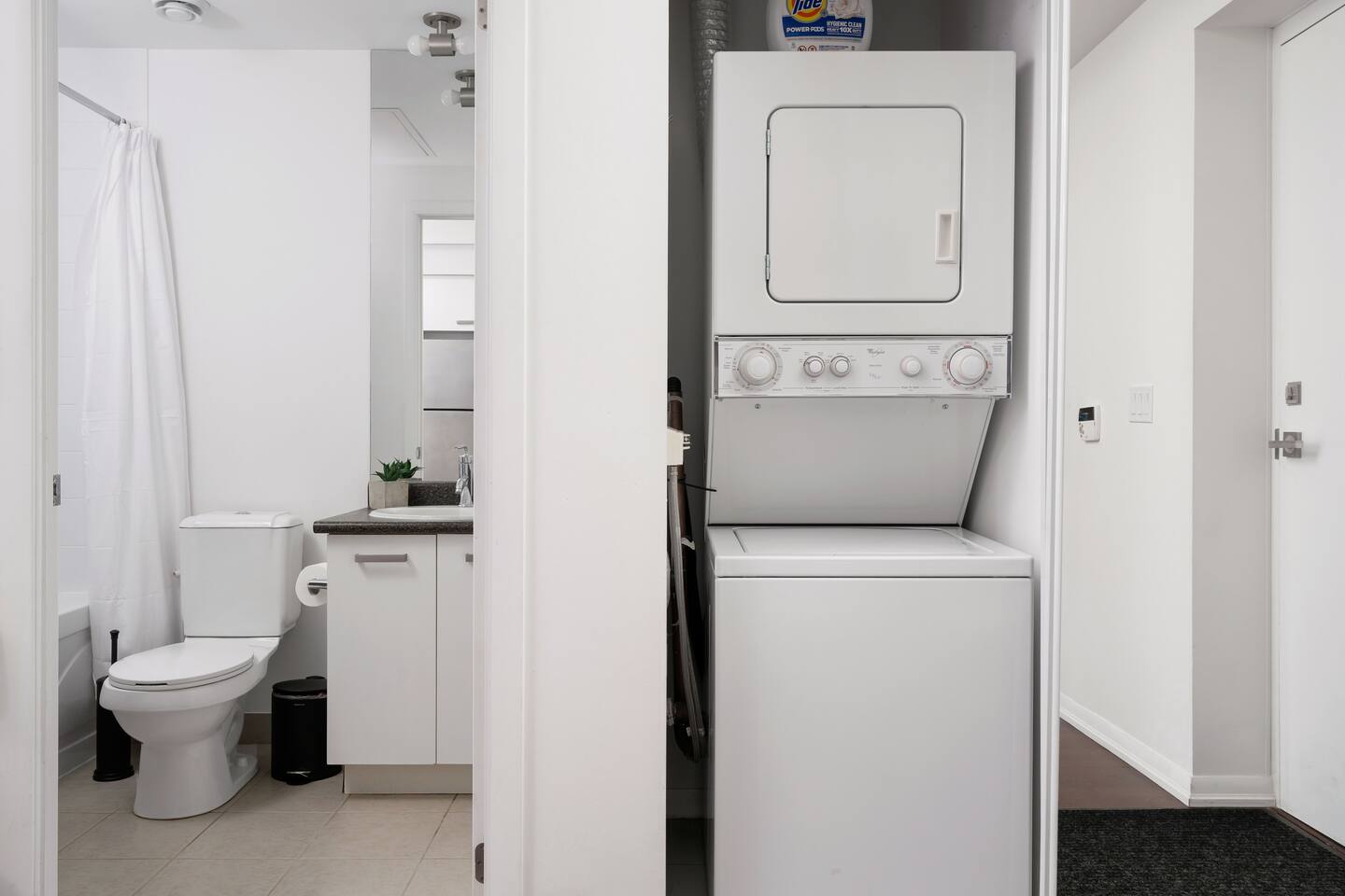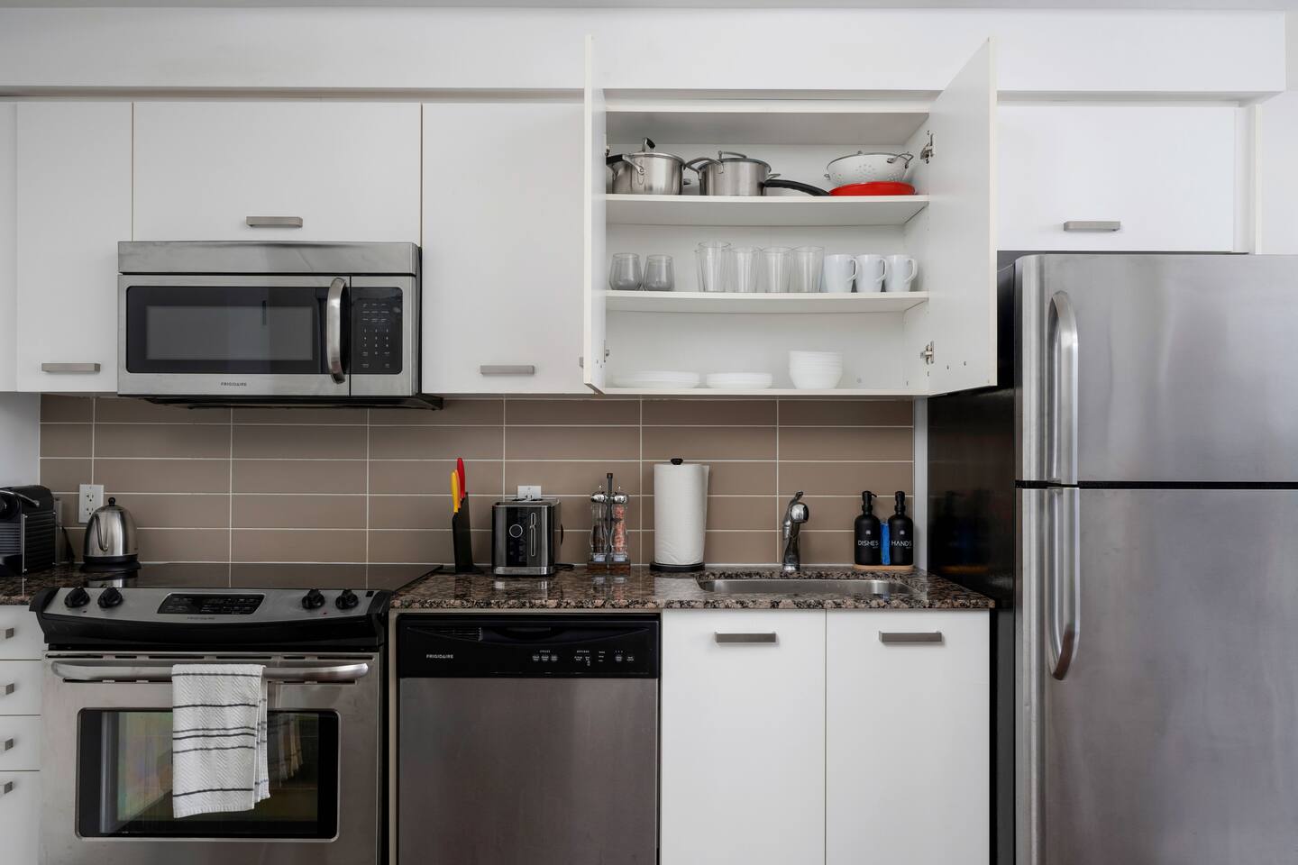 Perfect for two guests, this bright and cozy one-bedroom suite features a comfortable queen bed and pleasant views. You'll find a fully equipped kitchen, in-unit washer and dryer, and a foldable dining table designed to save space while keeping things practical and stylish. Note: There is no parking in the building, but you can check prices and availability on the Parkopedia website.