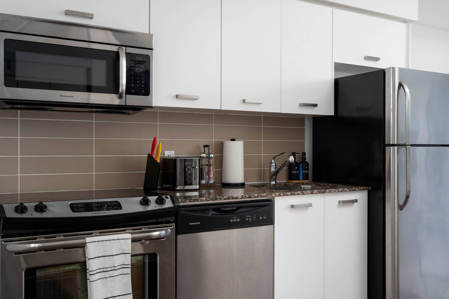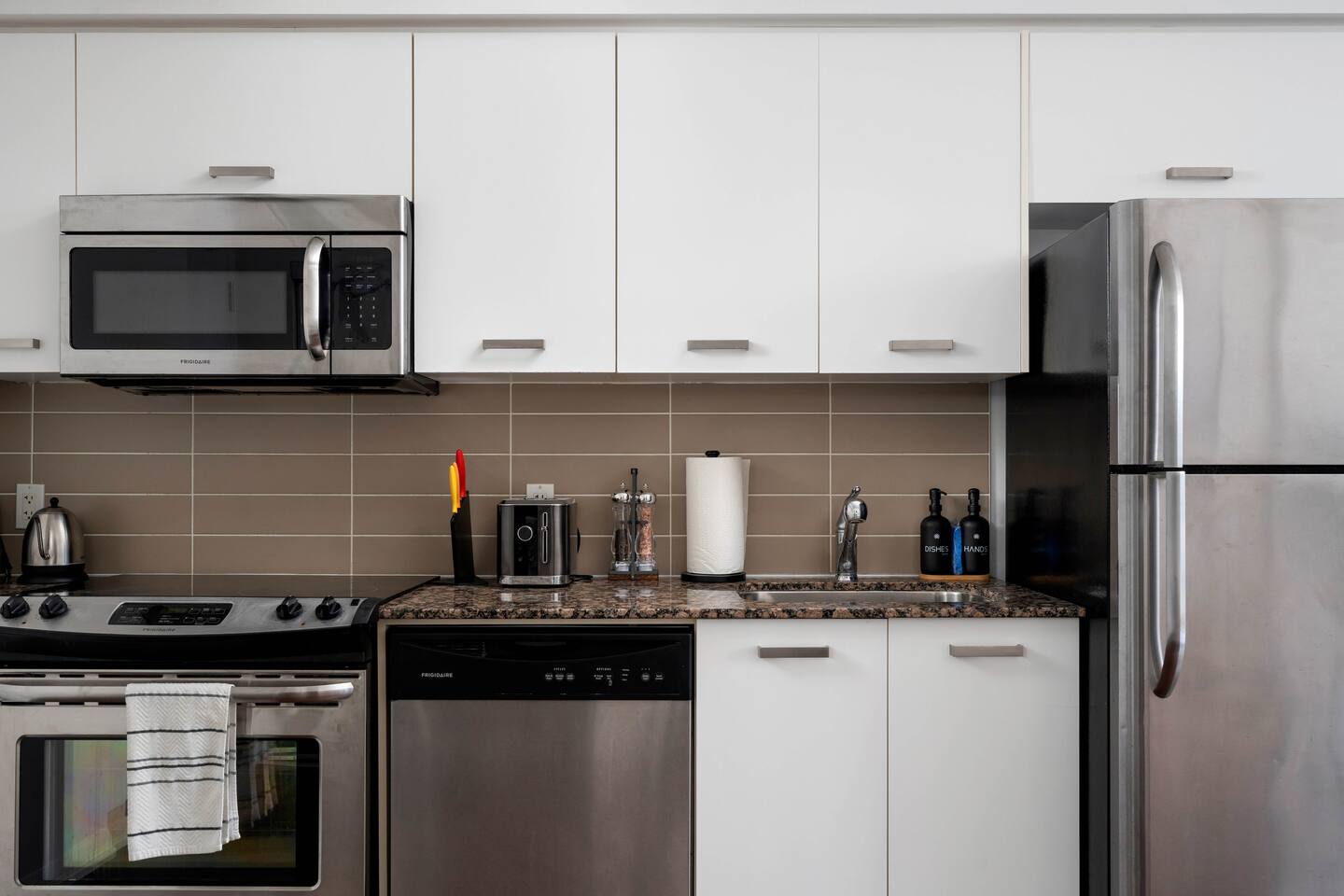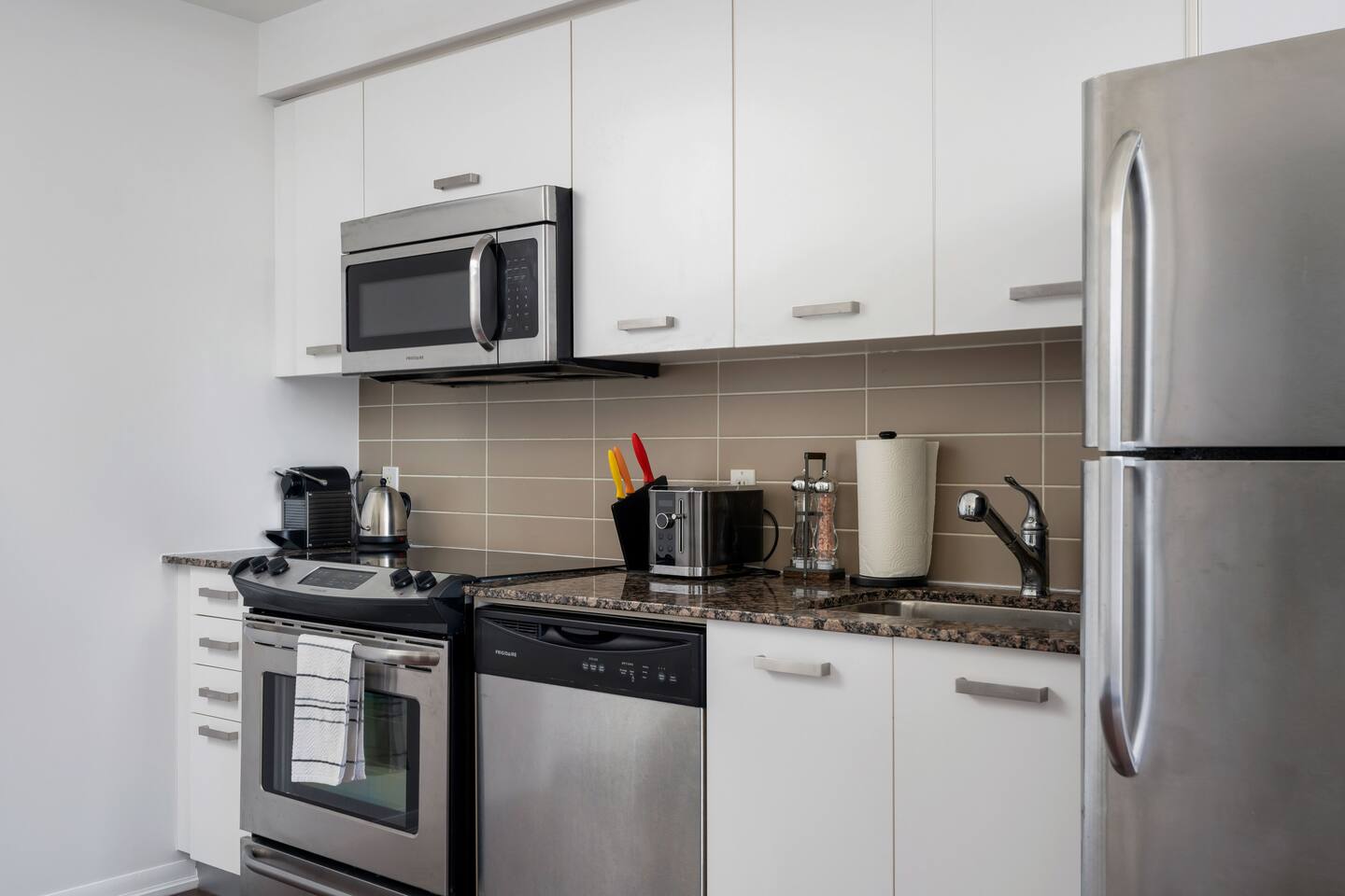 Perfect for two guests, this bright and cozy one-bedroom suite features a comfortable queen bed and pleasant views. You'll find a fully equipped kitchen, in-unit washer and dryer, and a foldable dining table designed to save space while keeping things practical and stylish. Note: There is no parking in the building, but you can check prices and availability on the Parkopedia website.