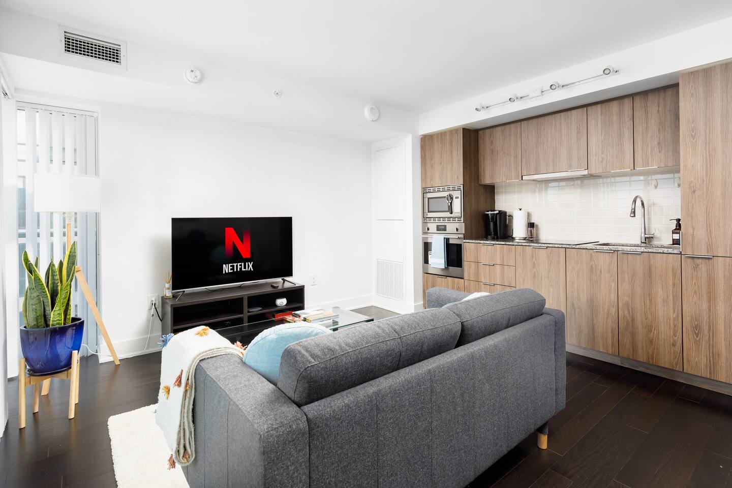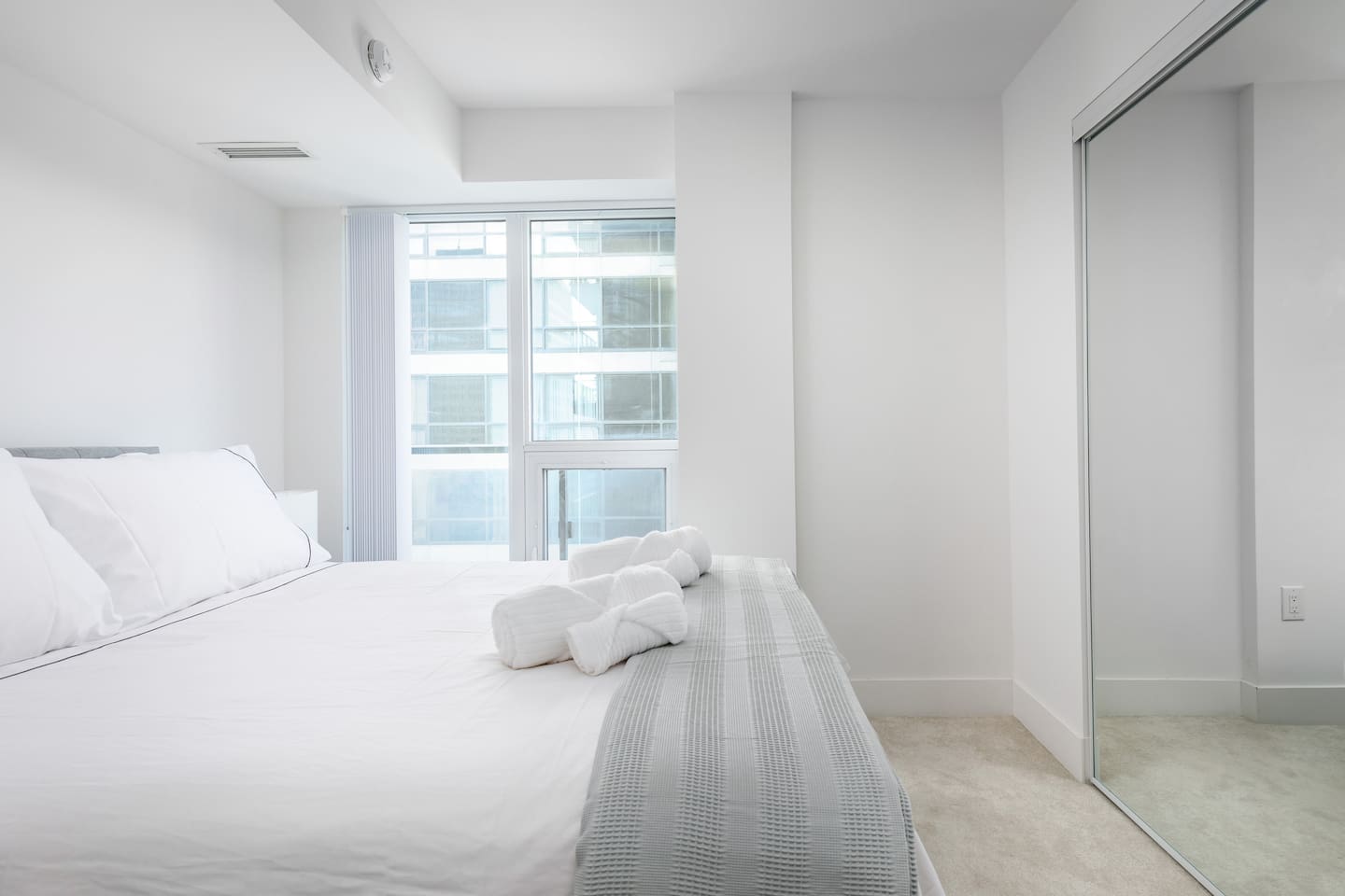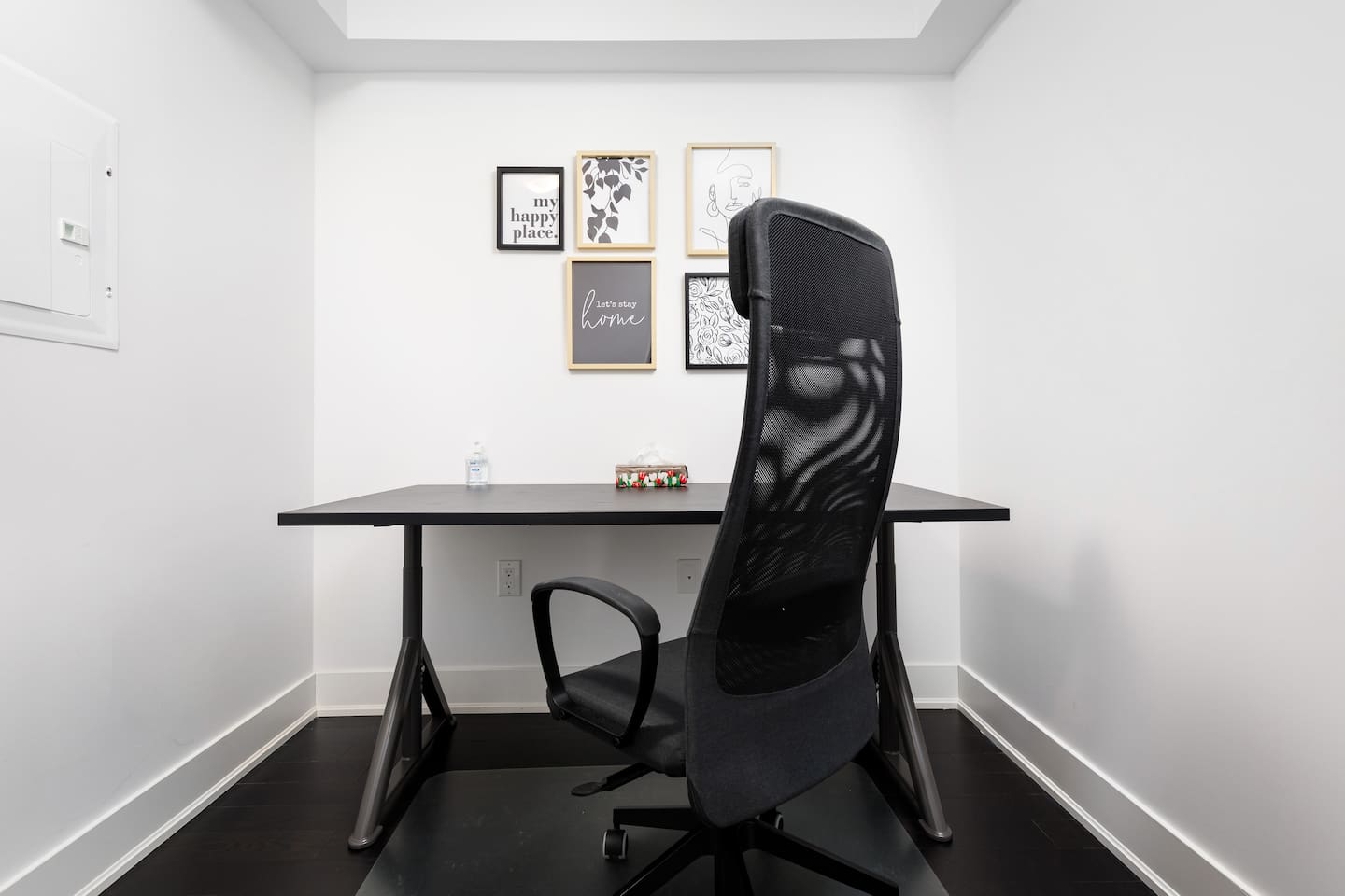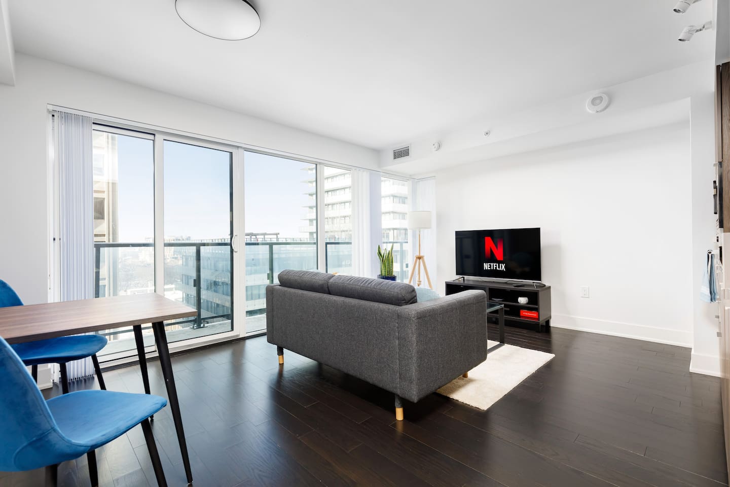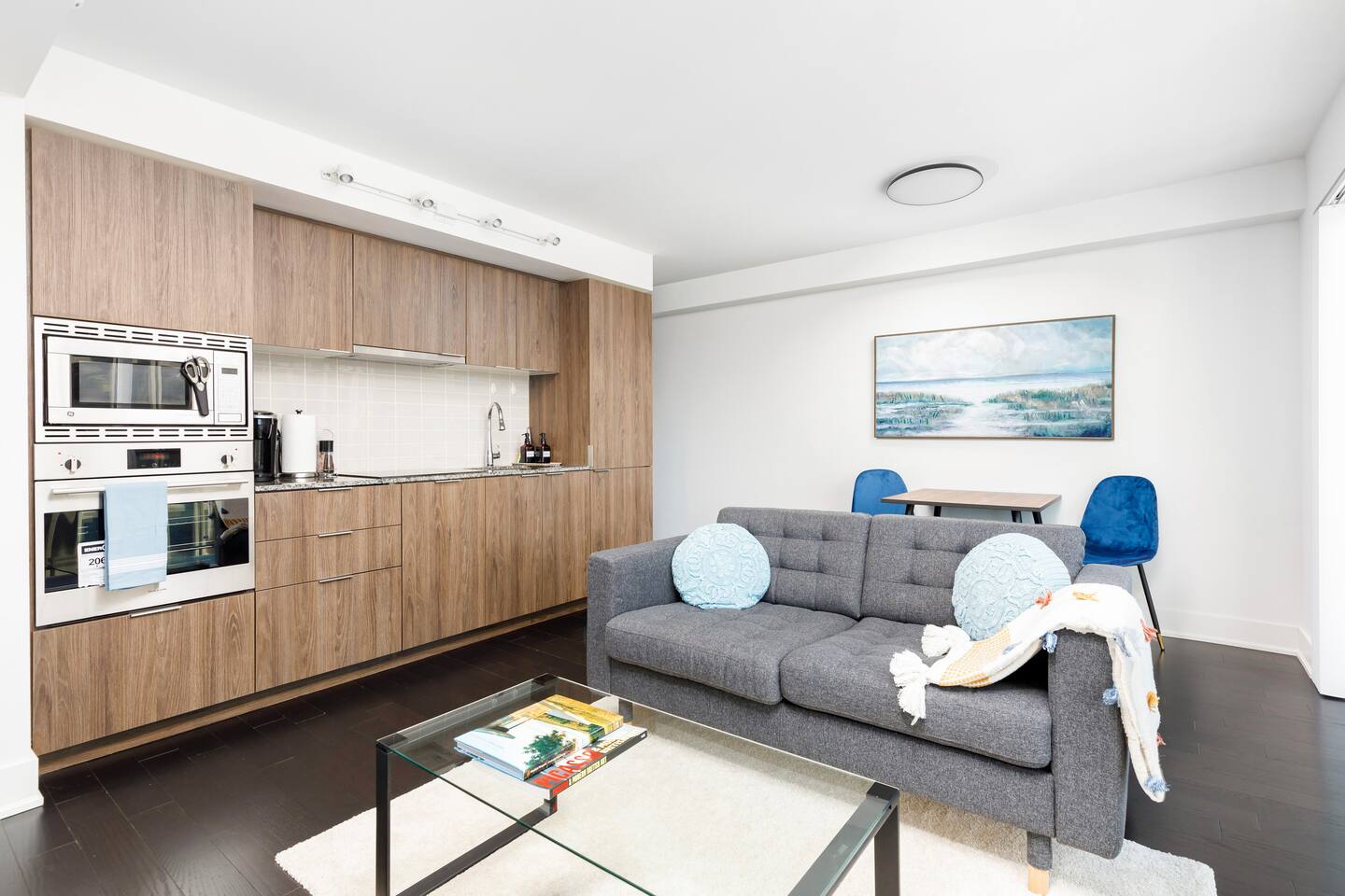 Highlights of the Space: Modern one-bedroom condo with a comfortable queen-size bed Fully equipped kitchen stocked with all essential cookware and basics In-suite laundry for added convenience during longer stays Dedicated workspace with an ergonomic chair, ideal for remote work or study Smart TV available — guests can stream their favorite shows by logging in with their own personal accounts Parking Information: Parking is not included Nearby parking options are available; rates and availability can be checked via the Parkopedia website.