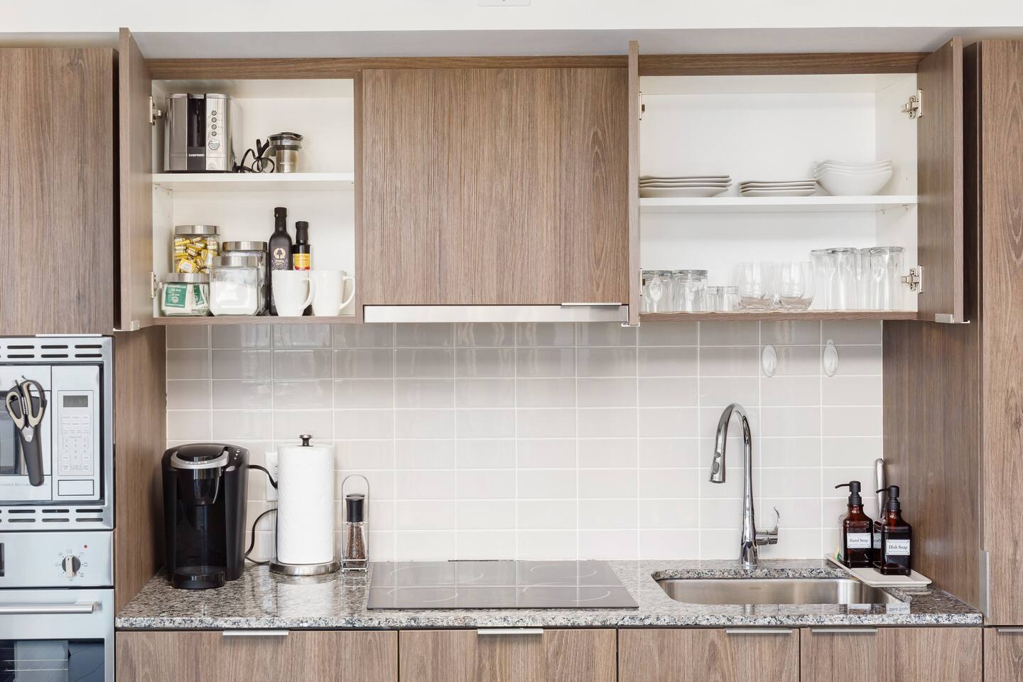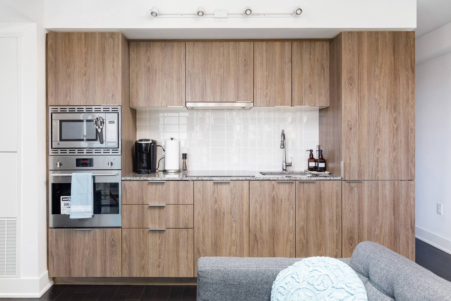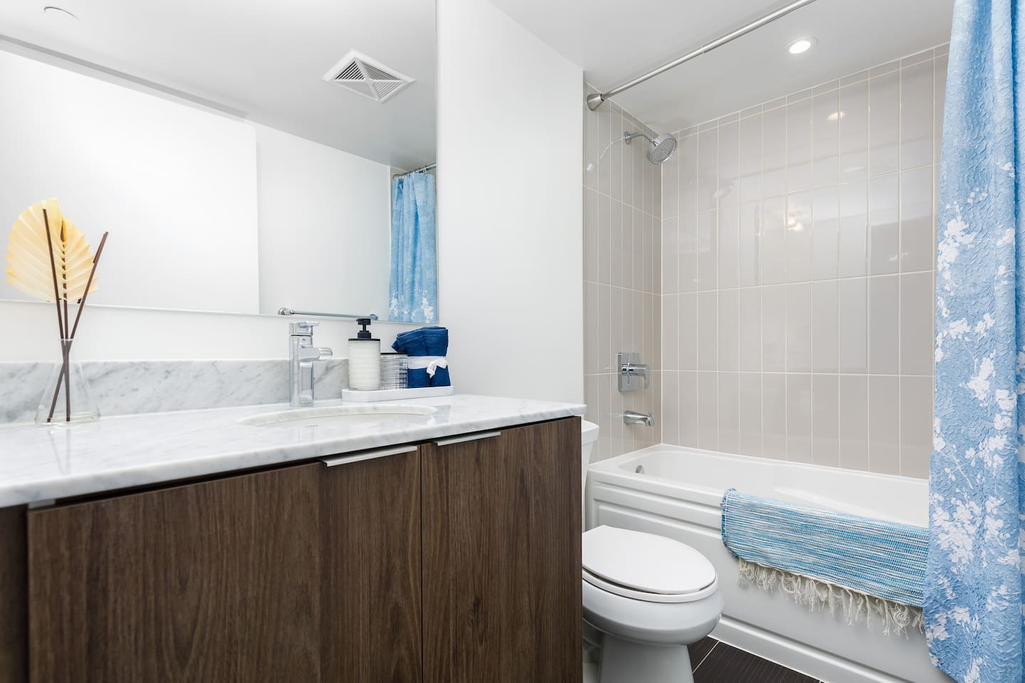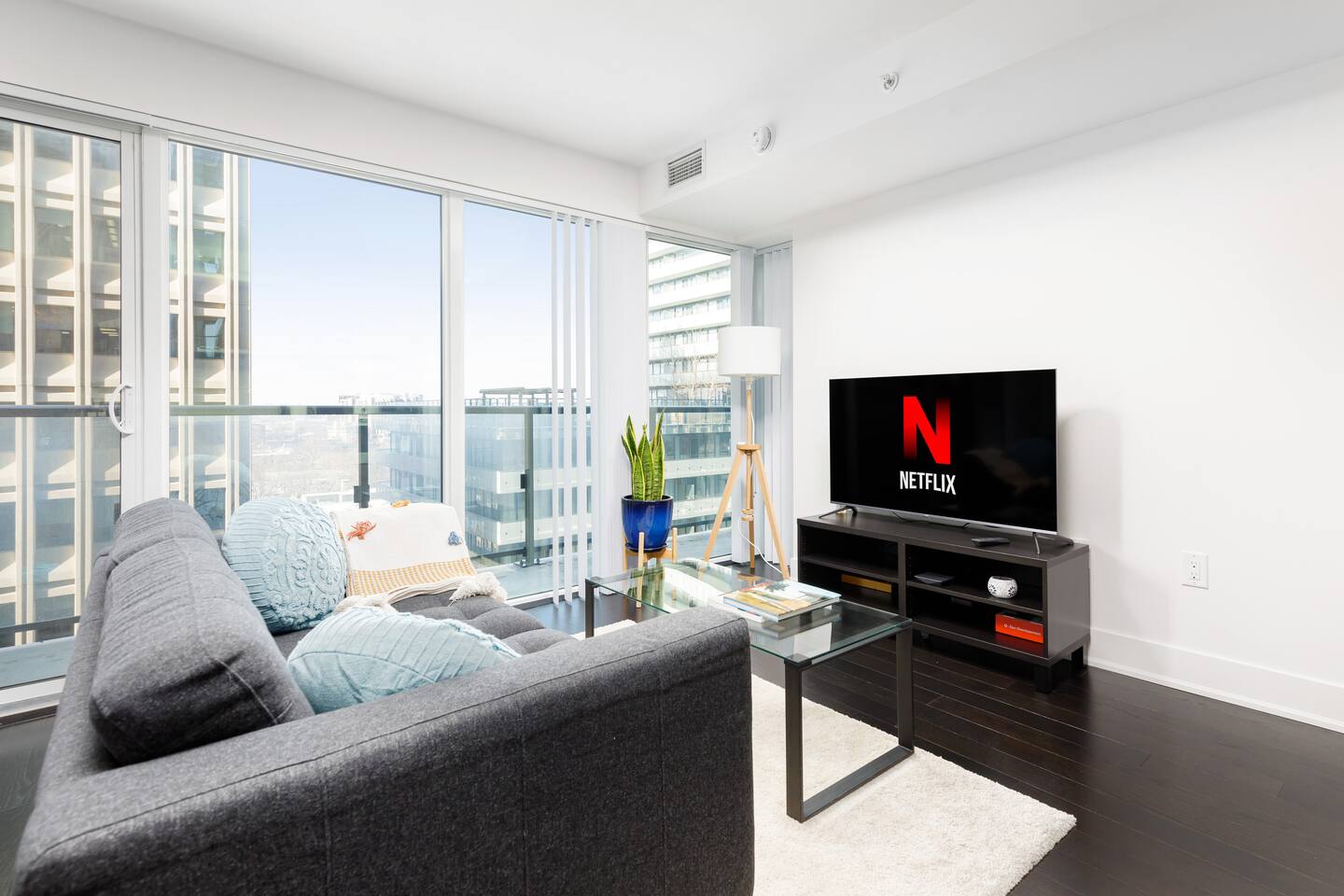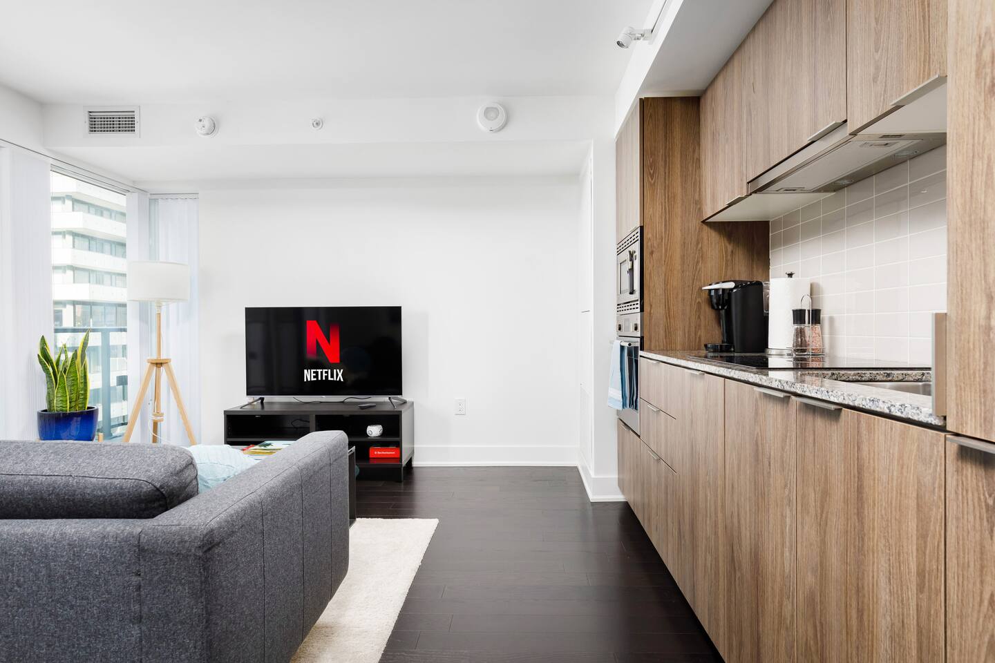 Highlights of the Space: Modern one-bedroom condo with a comfortable queen-size bed Fully equipped kitchen stocked with all essential cookware and basics In-suite laundry for added convenience during longer stays Dedicated workspace with an ergonomic chair, ideal for remote work or study Smart TV available — guests can stream their favorite shows by logging in with their own personal accounts Parking Information: Parking is not included Nearby parking options are available; rates and availability can be checked via the Parkopedia website.