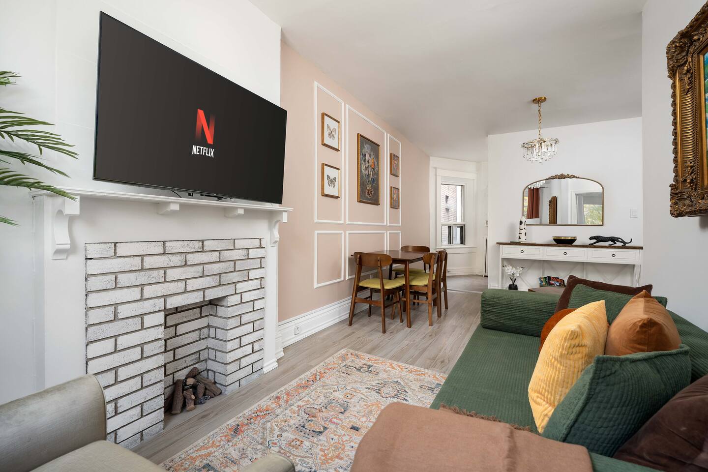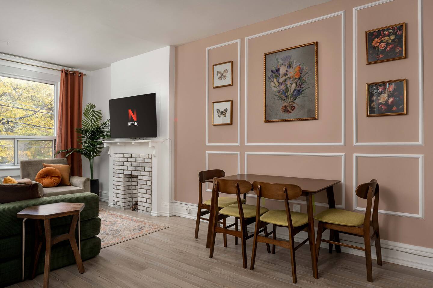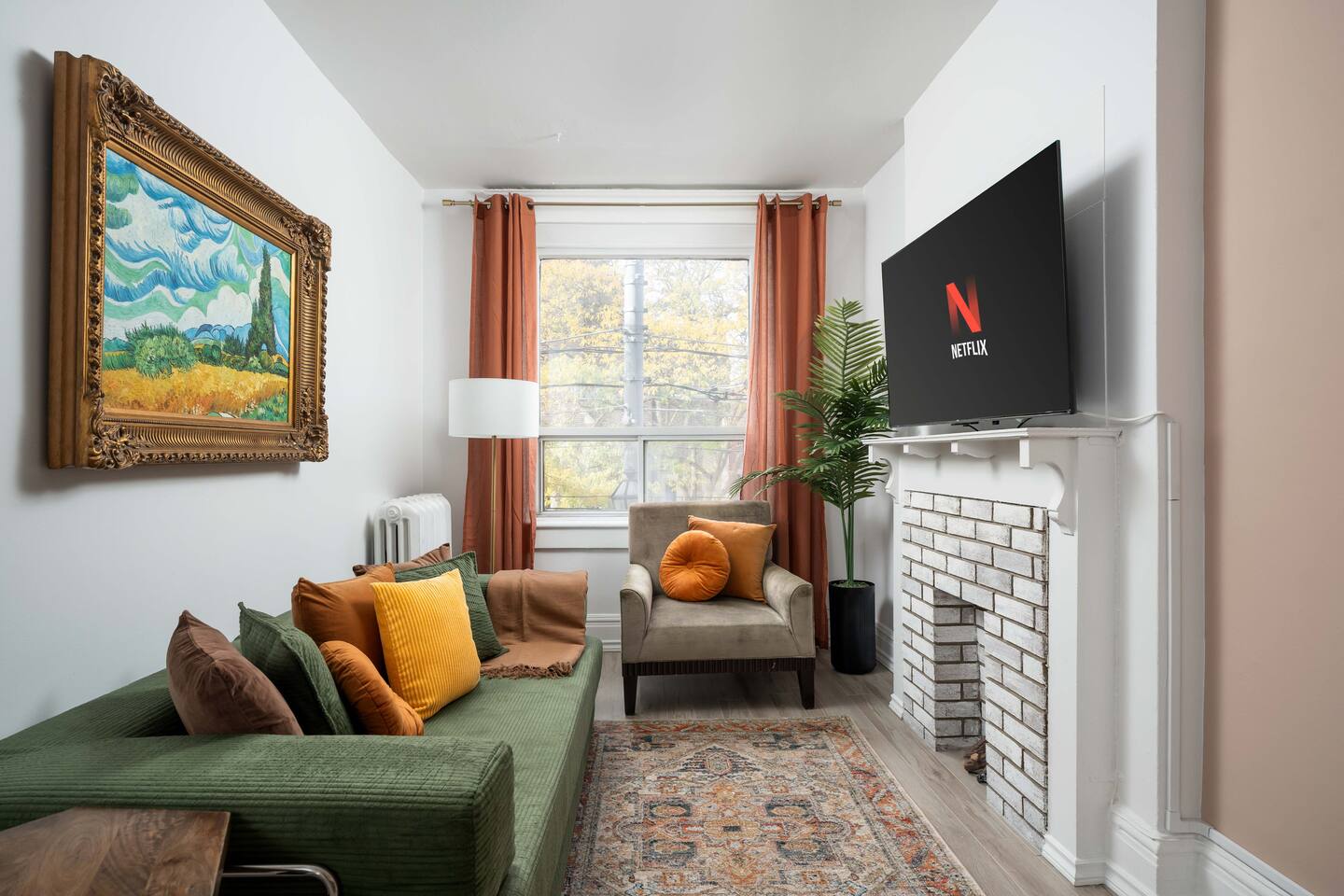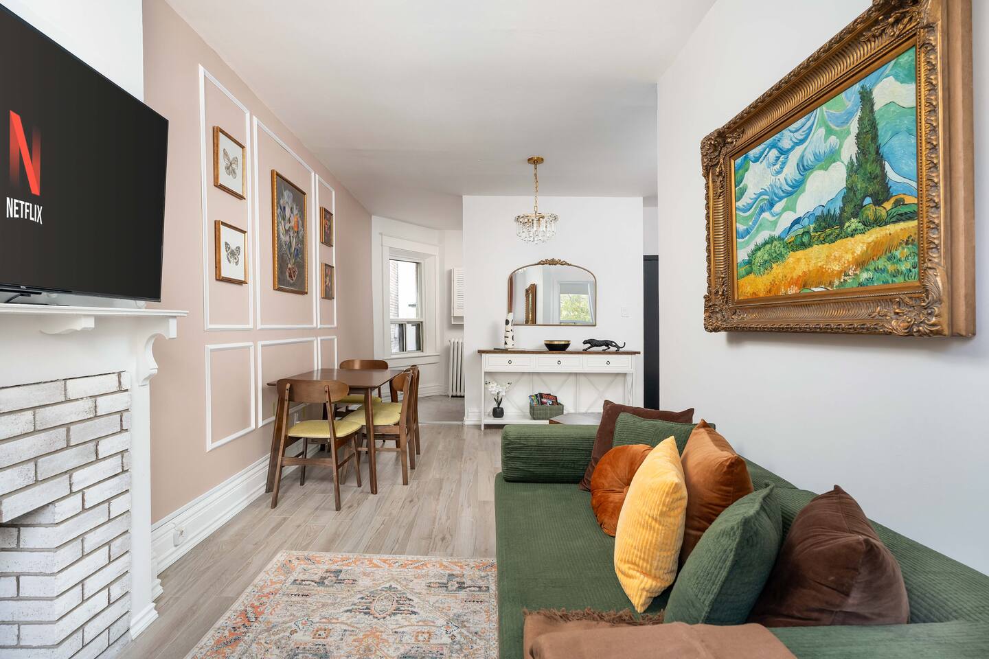 Welcome to your cozy, vintage-inspired retreat located in the heart of Toronto's Roncesvalles Village. This charming apartment is perfect for up to four guests and blends classic character with modern comfort. You'll find a spacious dining room, a lovely living room with a decorative fireplace, and a warm, inviting ambiance throughout the space. Whether you're traveling with family or friends, this is the ideal spot to relax and unwind after exploring the city.