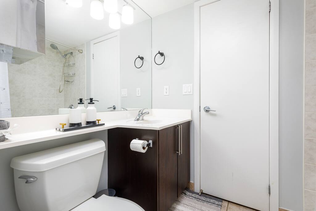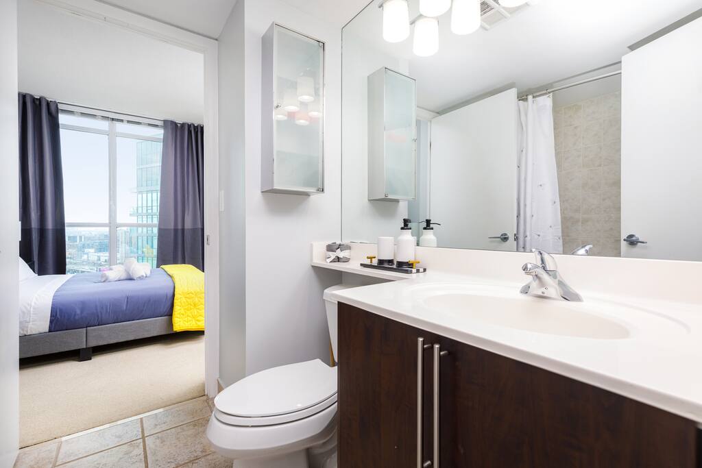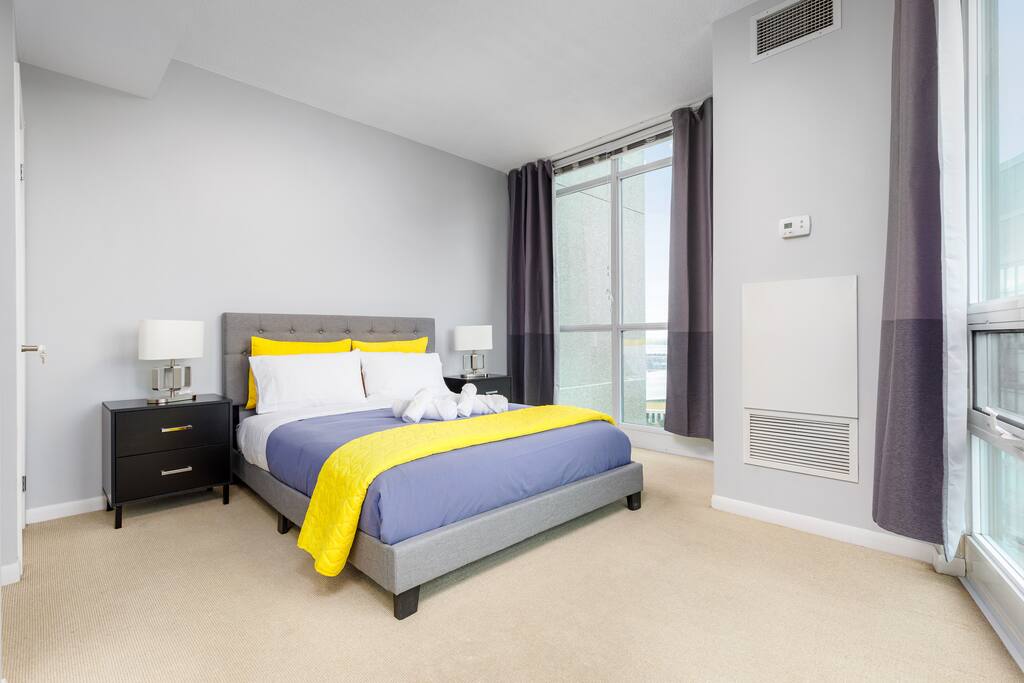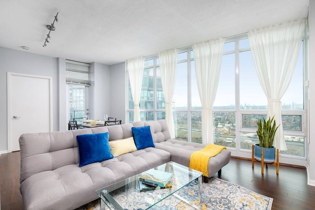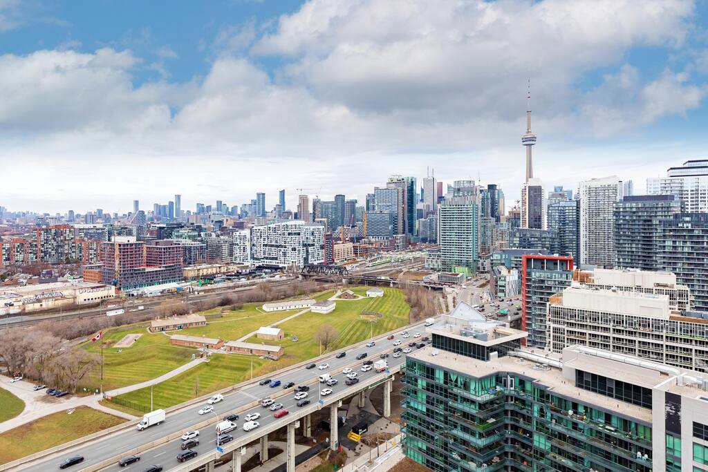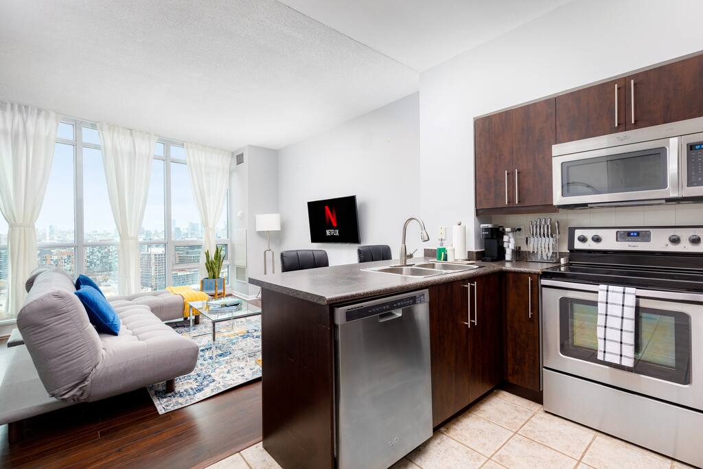 This stylish one-bedroom apartment in the Fort York area of downtown Toronto is steps away from major attractions like the Metro Toronto Convention Centre, Rogers Centre, and CN Tower. Enjoy stunning city skyline views while having all the essentials for a comfortable stay.