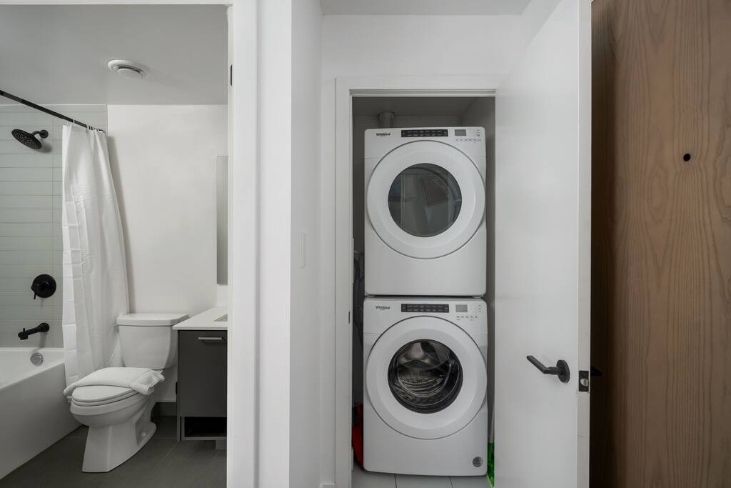 Guests have full access to the apartment, including both bedrooms, kitchen, living area, bathroom, balcony, and in-suite laundry